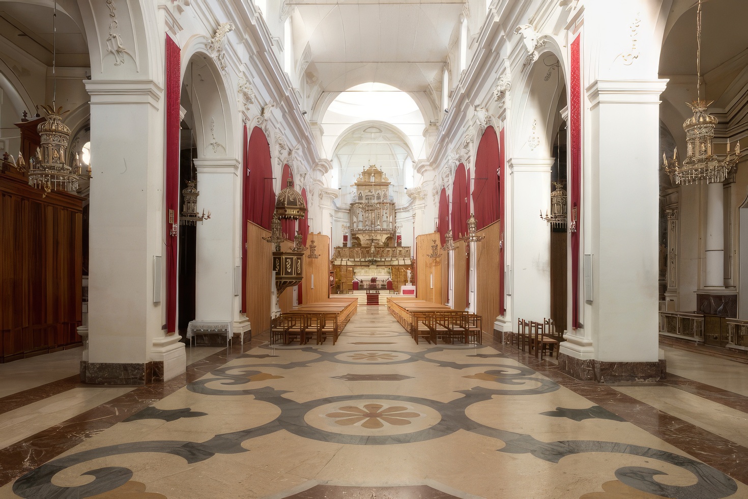 Dalla pianta a croce latina e tre navate, è sovrastata da un’altissima cupola. Il prospetto e il campanile in pietra intagliata sono in stile Barocco.