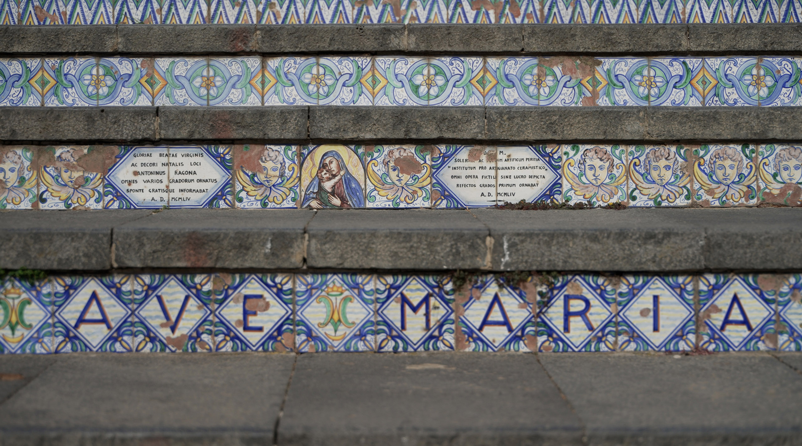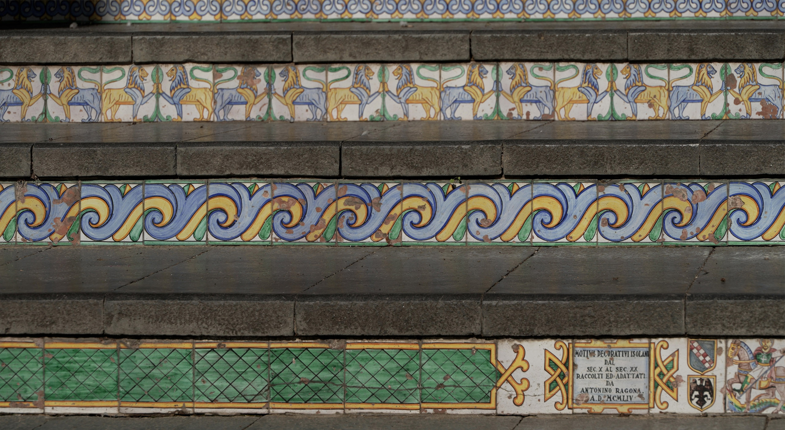 Le maioliche sono ornate con motivi isolani datati dal X al XX secolo, raccolti e adattati dal prof. Antonino Aragona. Fu l’architetto Marino però a dar vita allo sfavillante sistema d’illuminazione della Scala in occasione delle feste patronali della città, attraverso l’accensione programmata di quattromila “coppi” colorati (lucerne dette “lumere”), collocati la notte prima della festa secondo uno specifico disegno e una progettazione che necessita un mese di preparazione: gli addetti si tramandano quest’arte di padre in figlio.