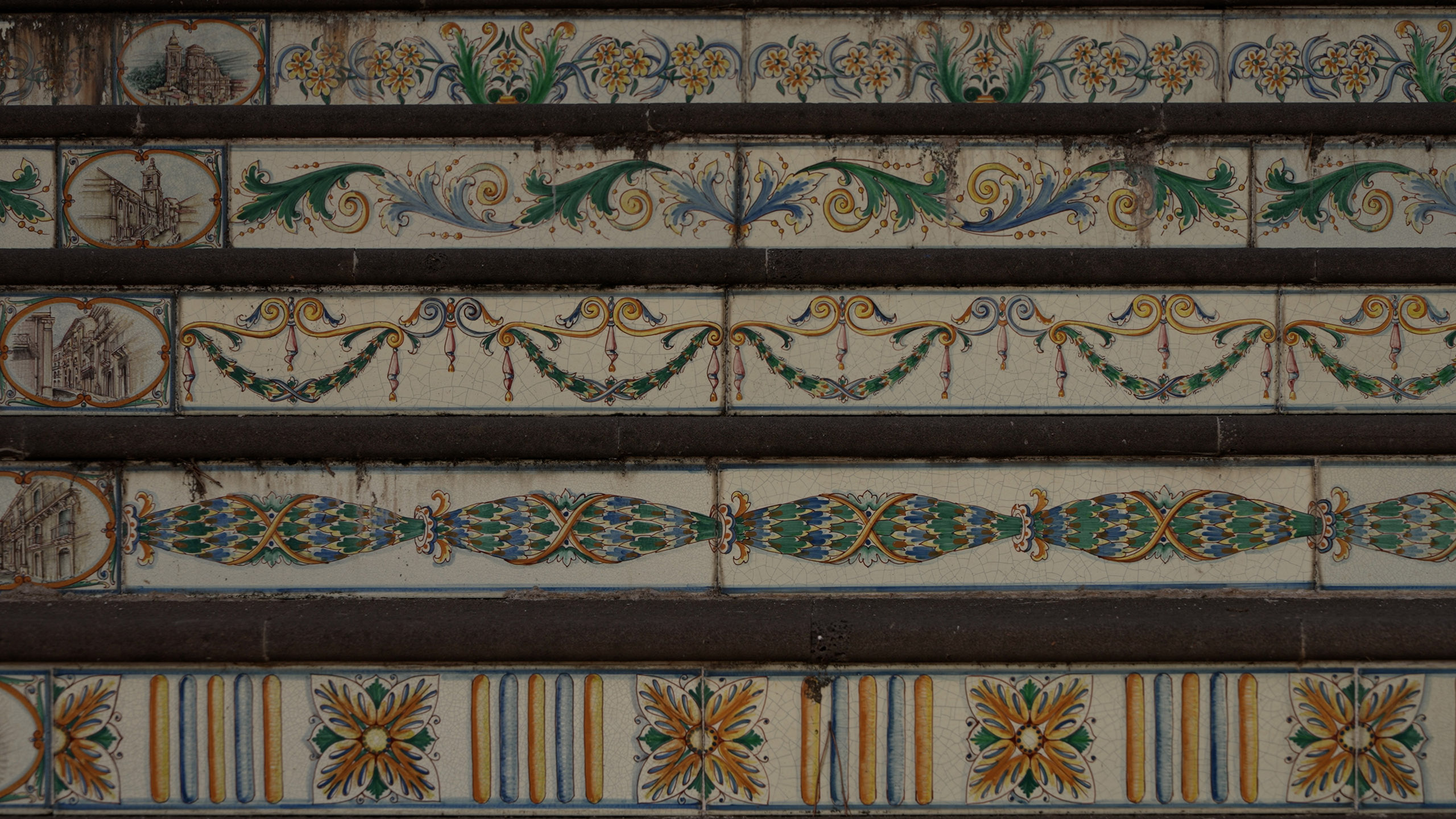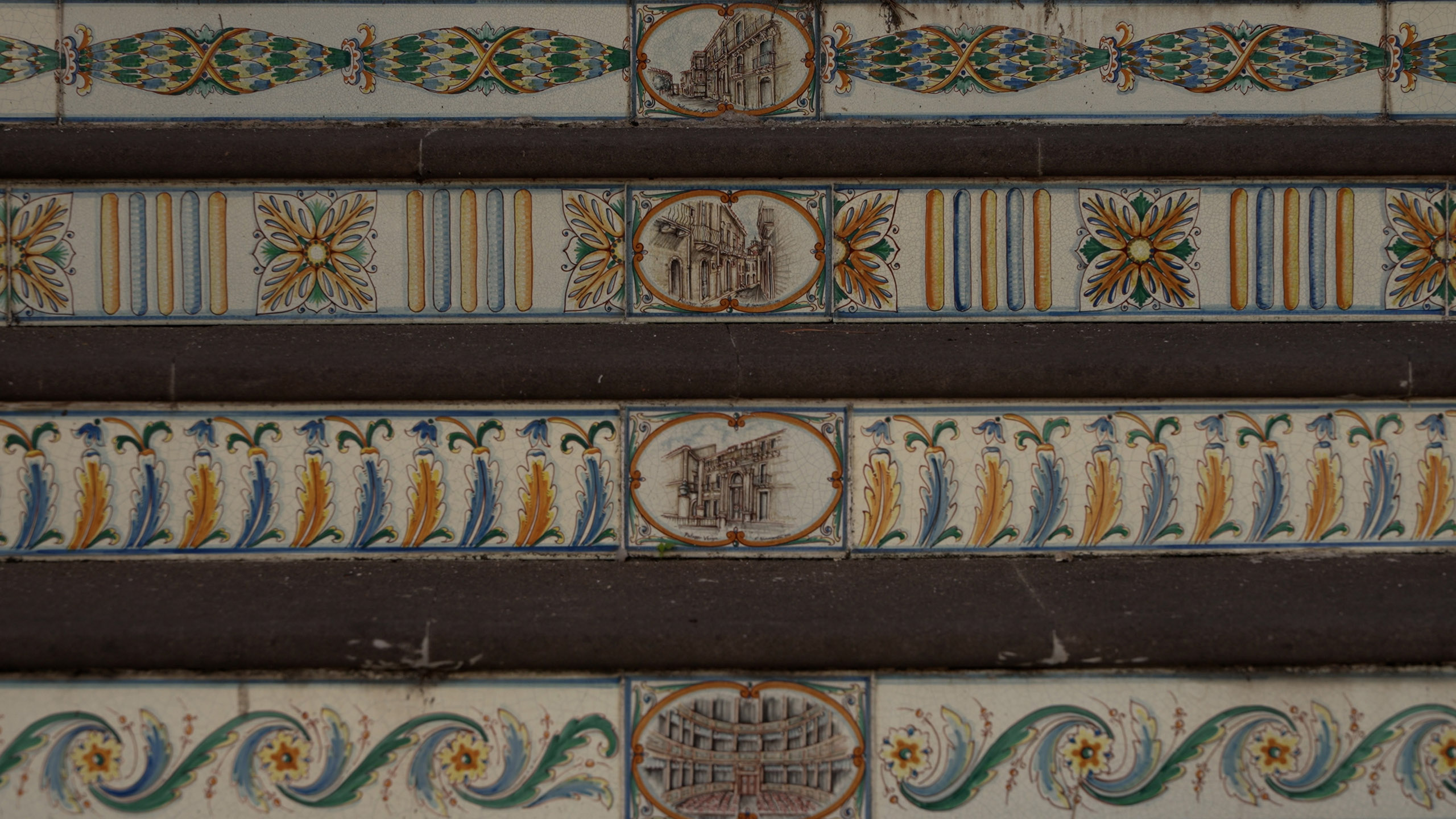 Ogni gradone, in pietra basaltica locale smaltata, è decorato sull’alzata con maioliche a motivi geometrici e floreali, con al centro un medaglione con scorci dei palazzi vizzinesi.