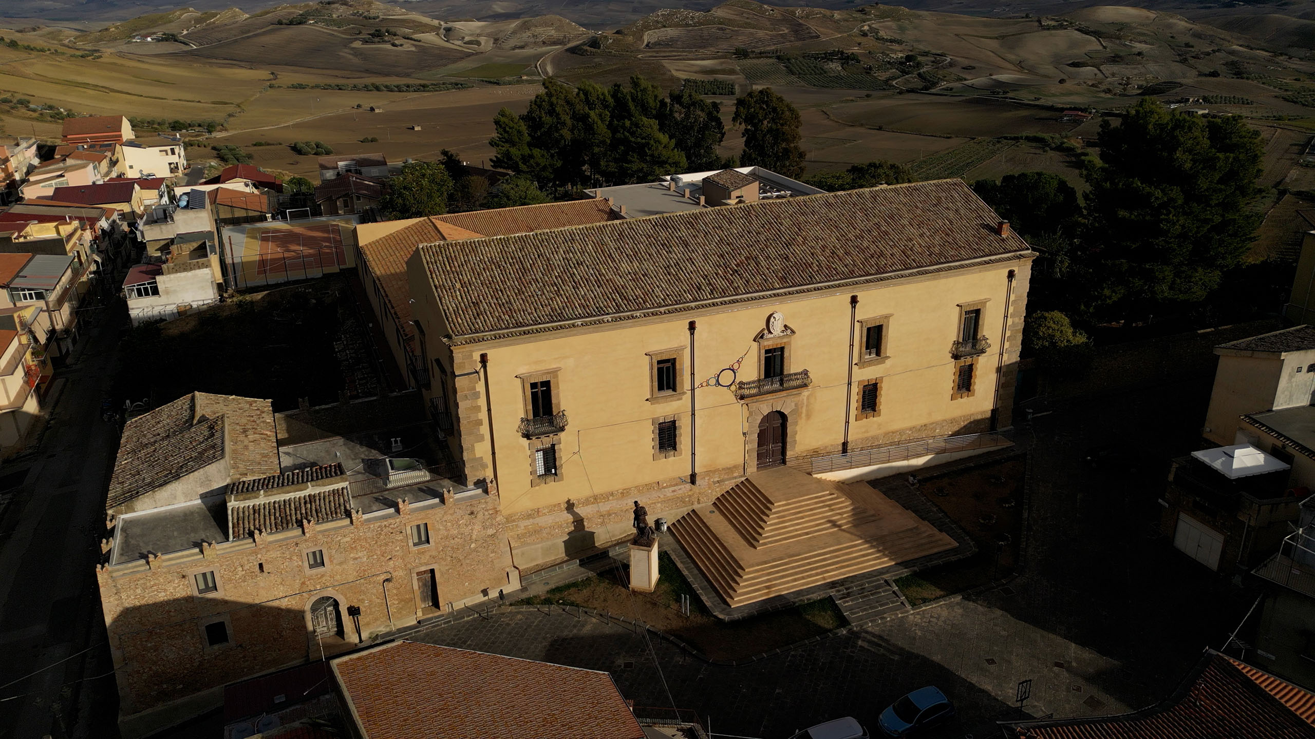 Nell’androne si nota una grande cisterna alimentata da acque piovane, con colonnine in ferro battuto. Al piano superiore sono conservati alcuni mobili e quadri appartenuti alla famiglia Biscari.