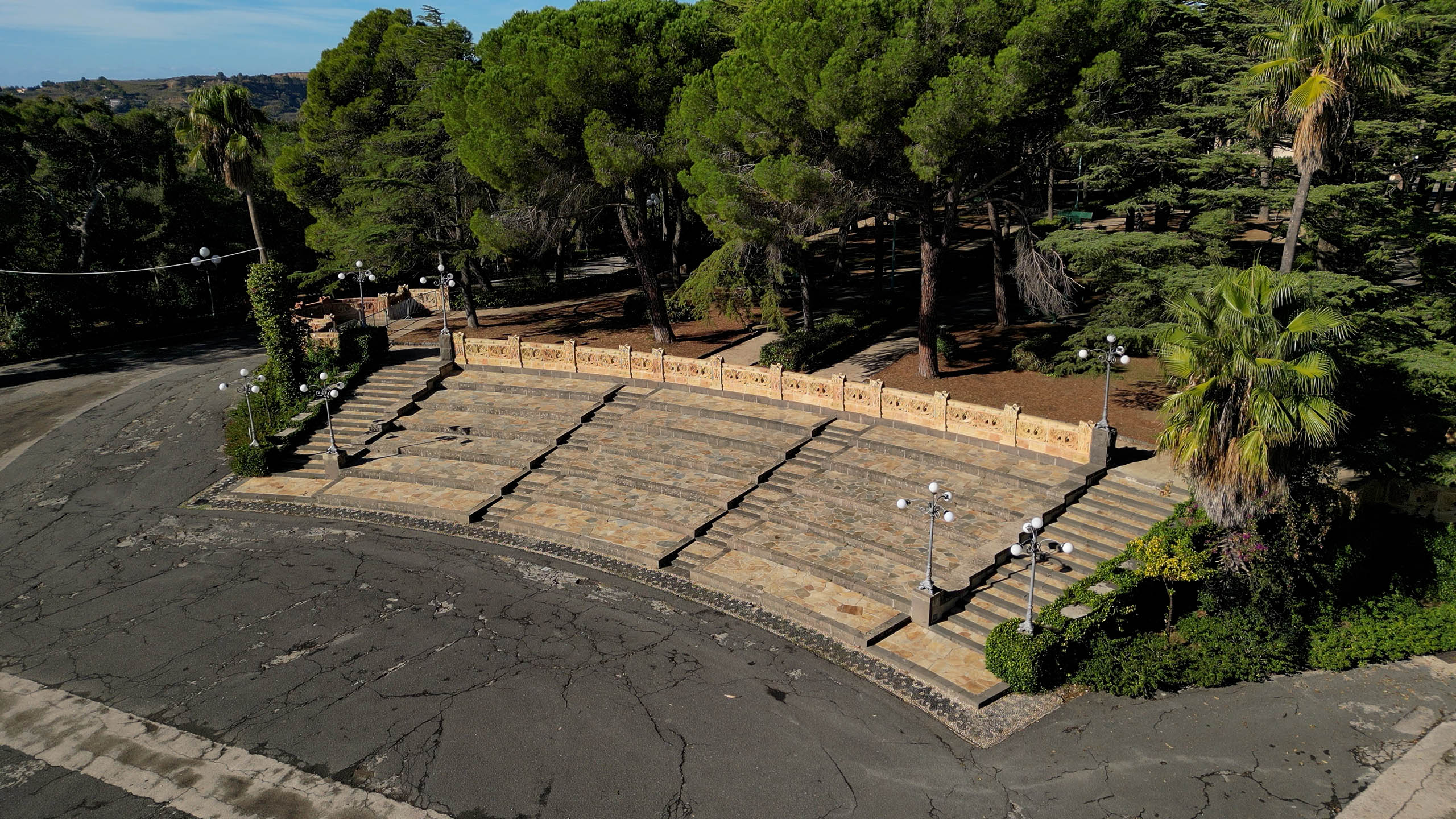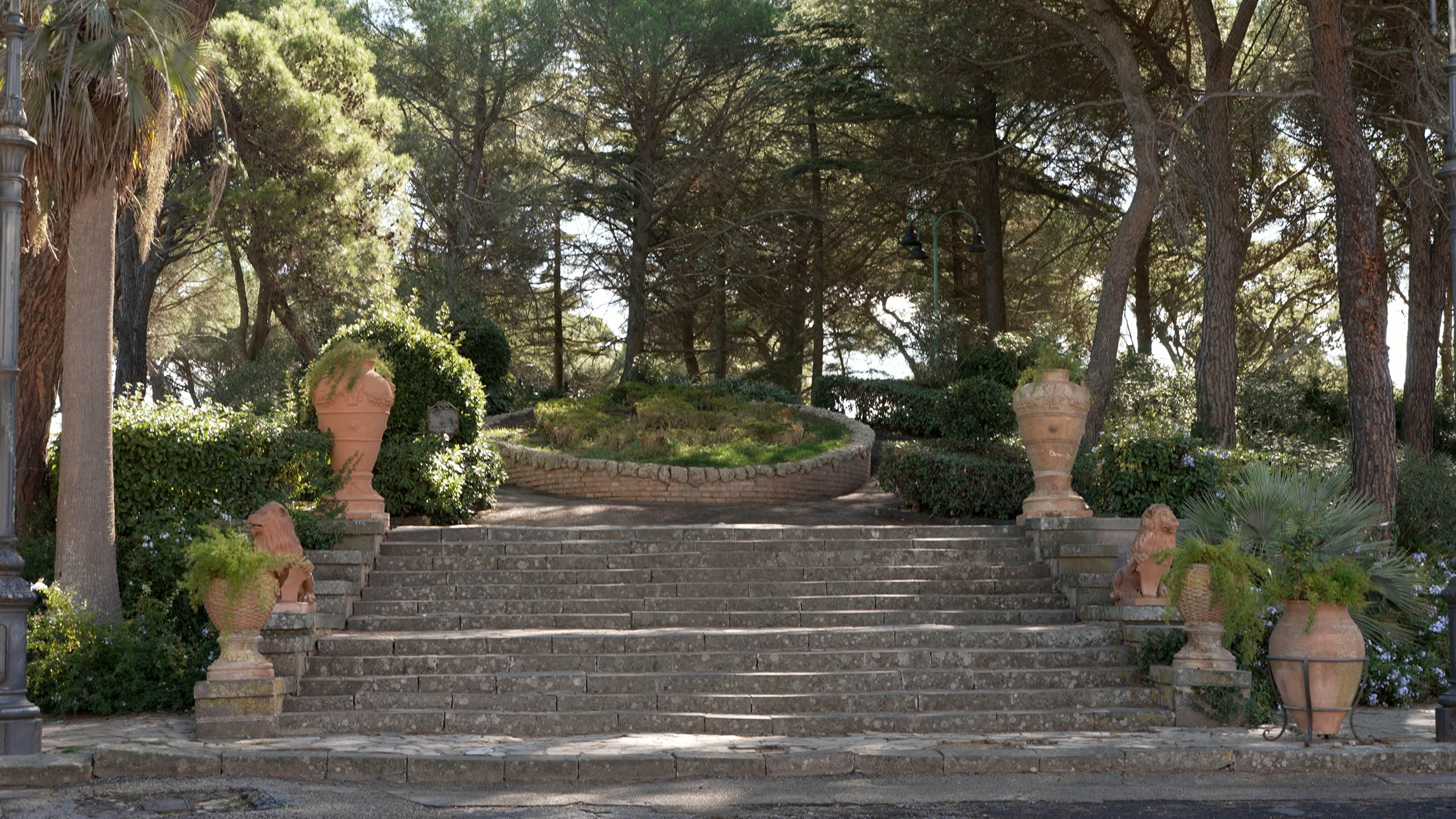 Dall’ingresso di viale Principessa Maria José, scendendo la duplice scalinata, si trovano due pannelli in maiolica di Gianni Ballarò e, in una nicchia, una statua raffigurante Cerere di Nicolò Barrano.