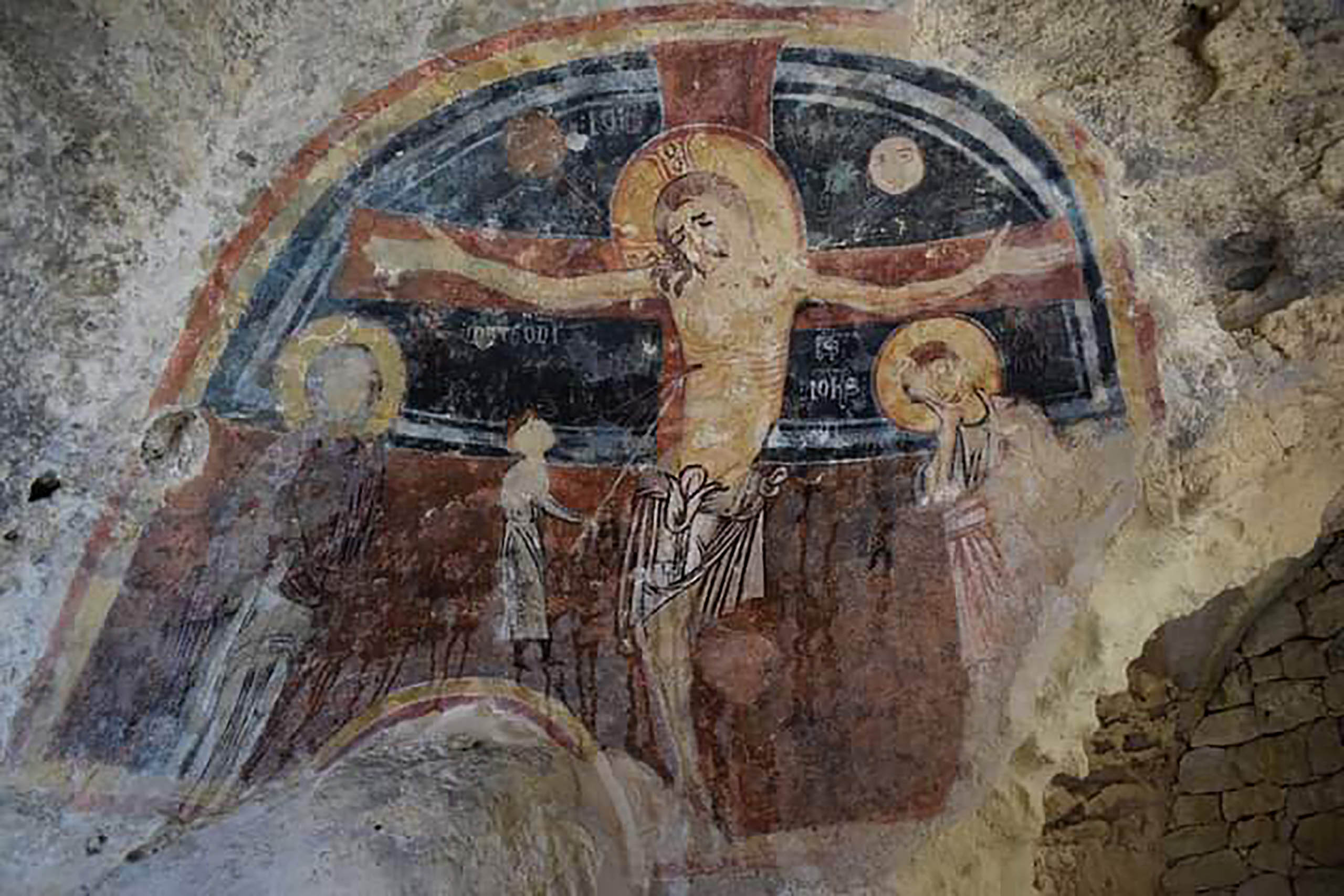 In particolare, la scena in cui è raffigurata la Crocifissione, risalirebbe all’XI e XII secolo, e mostrerebbe il Cristo crocifisso centrale con a fianco la Vergine e San Giovanni con il capo piegato. In basso trova spazio la figura di Longino nell’atto di trafiggere Gesù.